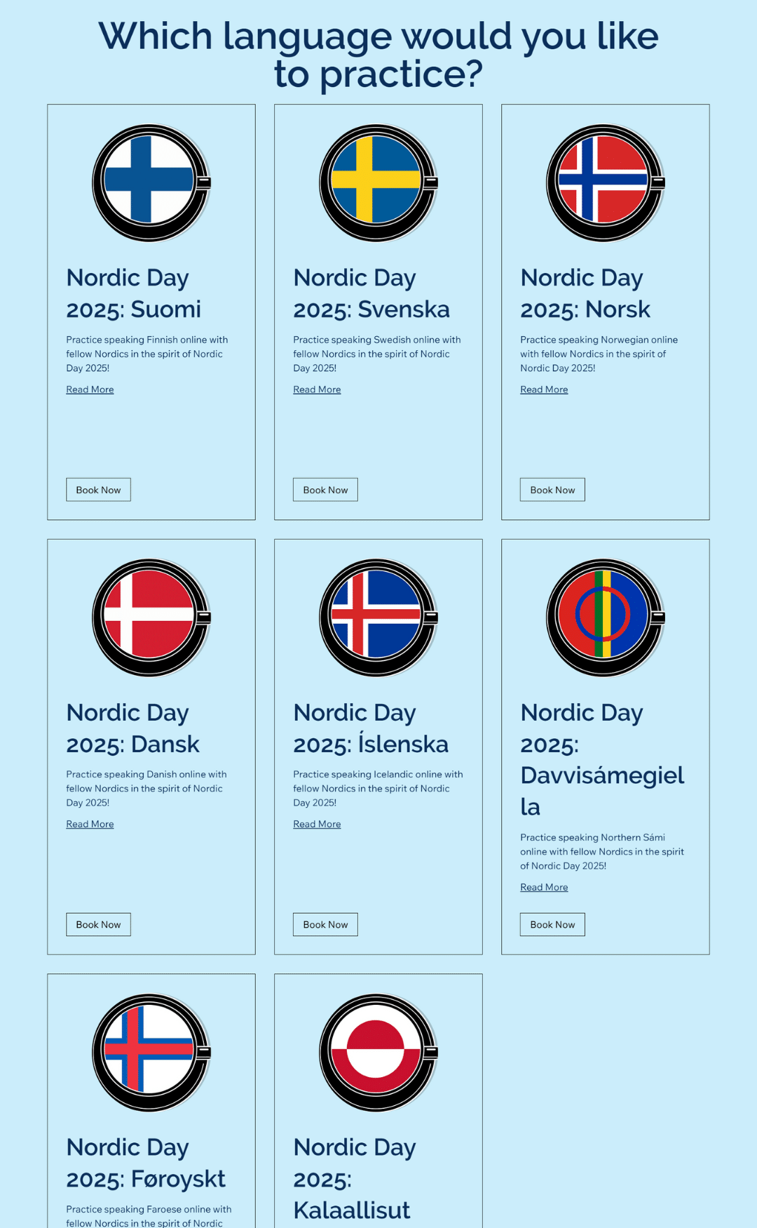 Språkcaféerna arrangeras på danska, finska, färöiska, grönländska, isländska, nordsamiska, norska och svenska, och ett antal svenska och norska språkcaféer hålls av några av våra engagerade ungdomsmedlemmar.